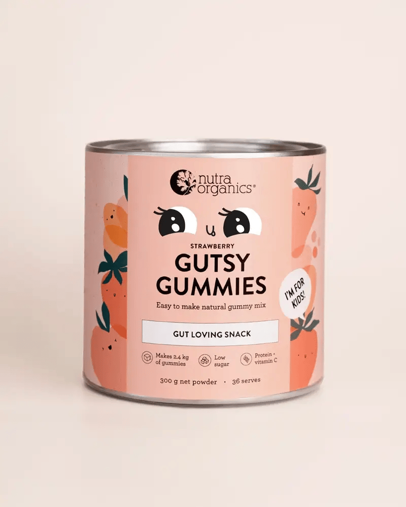 Gutsy Gummies Strawberry is a naturally delicious, low sugar snack to nourish kiddies and support their gut wellbeing. A fun and nutritious alternative to sugar-laden jellies and artificial gummies is finally here!