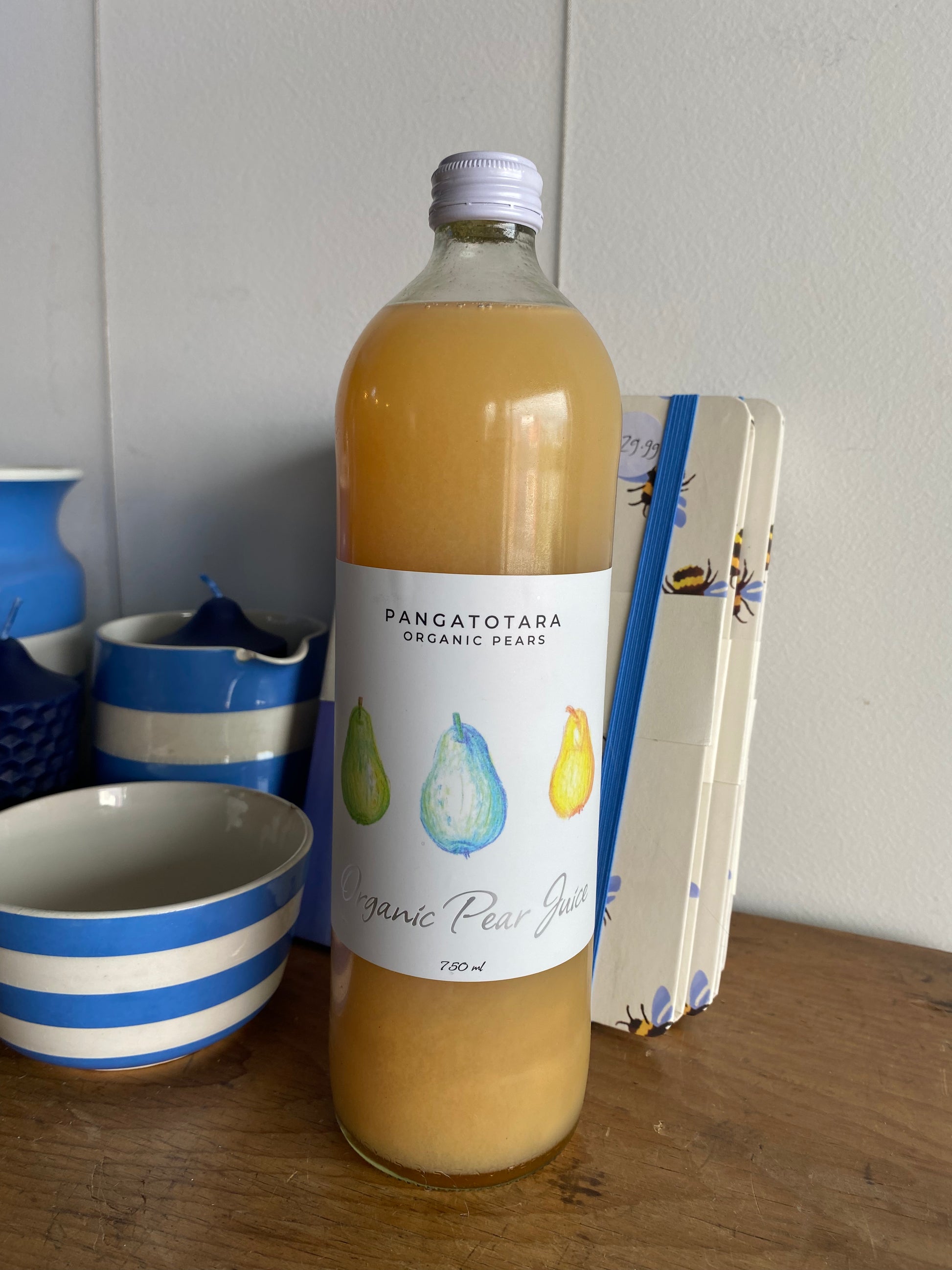 Pure cloudy pear juice from a small family orchard in the Motueka Valley, Tasman region.